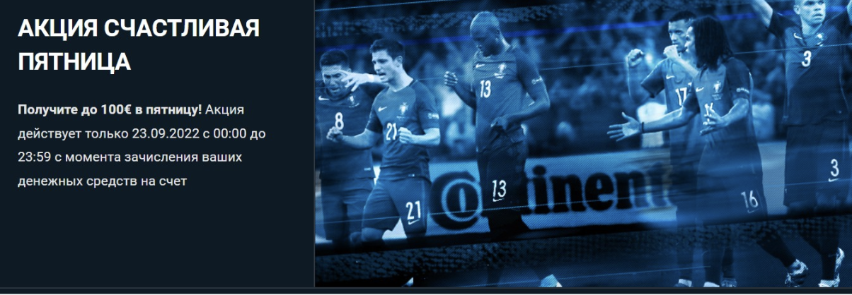 Акция от 1xBet проводится каждую пятницу. По сути, это повторный бонус на депозит, но имеющий более яркое название. Клиент, пополнивший счет в пятницу, получит бонус в размере 100% от суммы, но не более €100 евро (или эквивалент в валюте вашего счета).