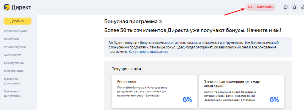 Чтобы посмотреть количество бонусов в рекламном кабинете, нужно выбрать в главном меню «Инструменты» – «Бонусная программа».
