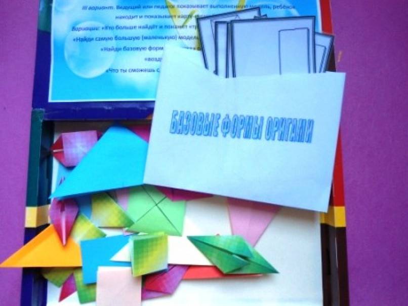 Ещё варианты: «Кто больше найдёт и покажет «треугольников» («книжек», «дверей»? «Найди и покажи самую большую (маленькую) модель базовой формы «двойной квадрат» («треугольник»).