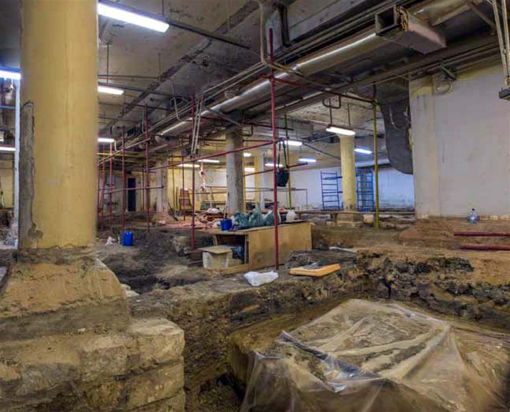 Общий вид одного из раскопов под 14-м корпусом Кремля. Под колоннами здания 1929−1932 гг. расчищены фундаменты, сложенные из белокаменных блоков из разобранных построек Чудова монастыря. Фото 2017 г. / ИА РАН