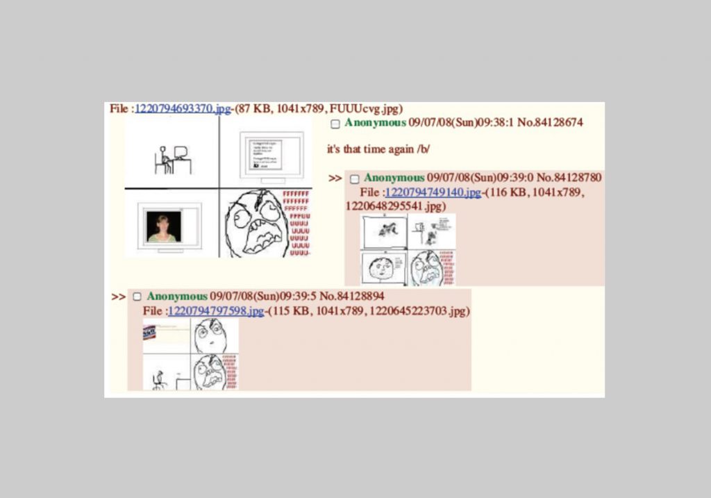 Для эпохи медиакультуры, пришедшей после эпохи текста, вопрос «Что здесь происходит?» является ключевым, и одновременно он является постоянным предметом игры. Анонимные имиджборды идеально приспособлены для игр такого рода, а также выращивания вирусного контента вроде мема FFFUUUU, такого же старого, как и ББПЕ. Популярность в соцсетях он приобрел лет через 5 после появления.