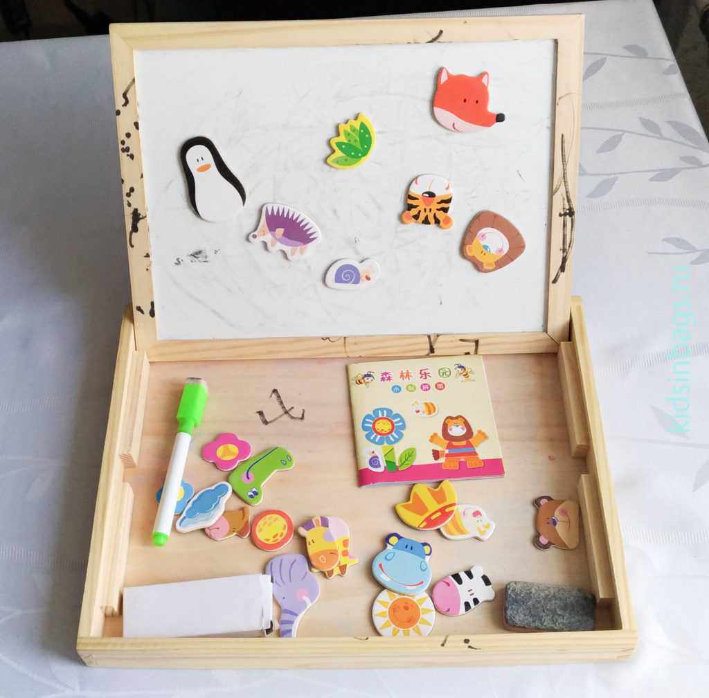 Магнитно-меловая доска двусторонняя: с одной стороны доски можно рисовать мелками, с другой стороны клеить магниты и рисовать специальным маркером. Магнитики были в комплекте. У нас магниты животных, которые нужно собирать.
