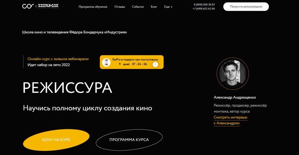Обучающая программа длится 4 месяца, содержит более 60 видеоуроков. Разберетесь в основах режиссуры, научитесь работать с идеями, готовиться к съёмкам, подбирать команду. Создадите первую работу для портфолио: клип или ролик для рекламы. Плюсы: бесплатный тест-драйв на 3 дня, индивидуальная проверка заданий, комментарии от куратора, скидка 20% при полной оплате курса.