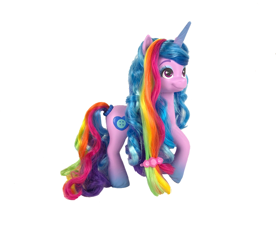 - There’s a new Izzy brushable shown on some of the slides. She has a rainbow-colored mane, and her cutie mark has a protruding button that you can press down to activate something.