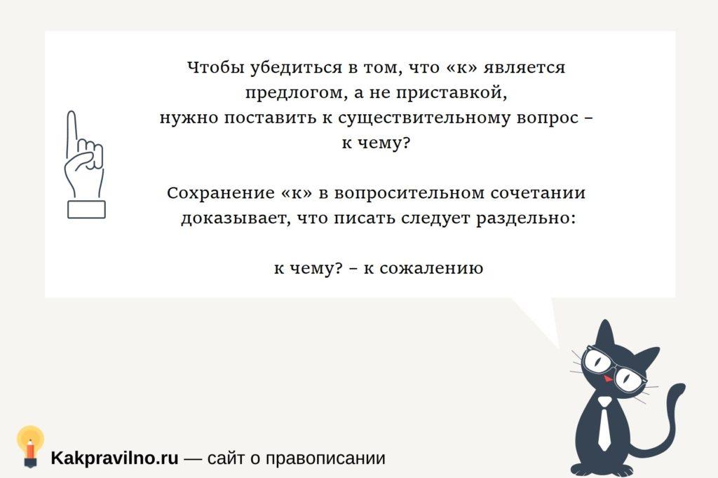 В русской письменности слово «к» может писаться вместе с последующем словом или раздельно. Например, выражение «к сожалению» пишется слитно, а выражение «к счастью» пишется раздельно.
