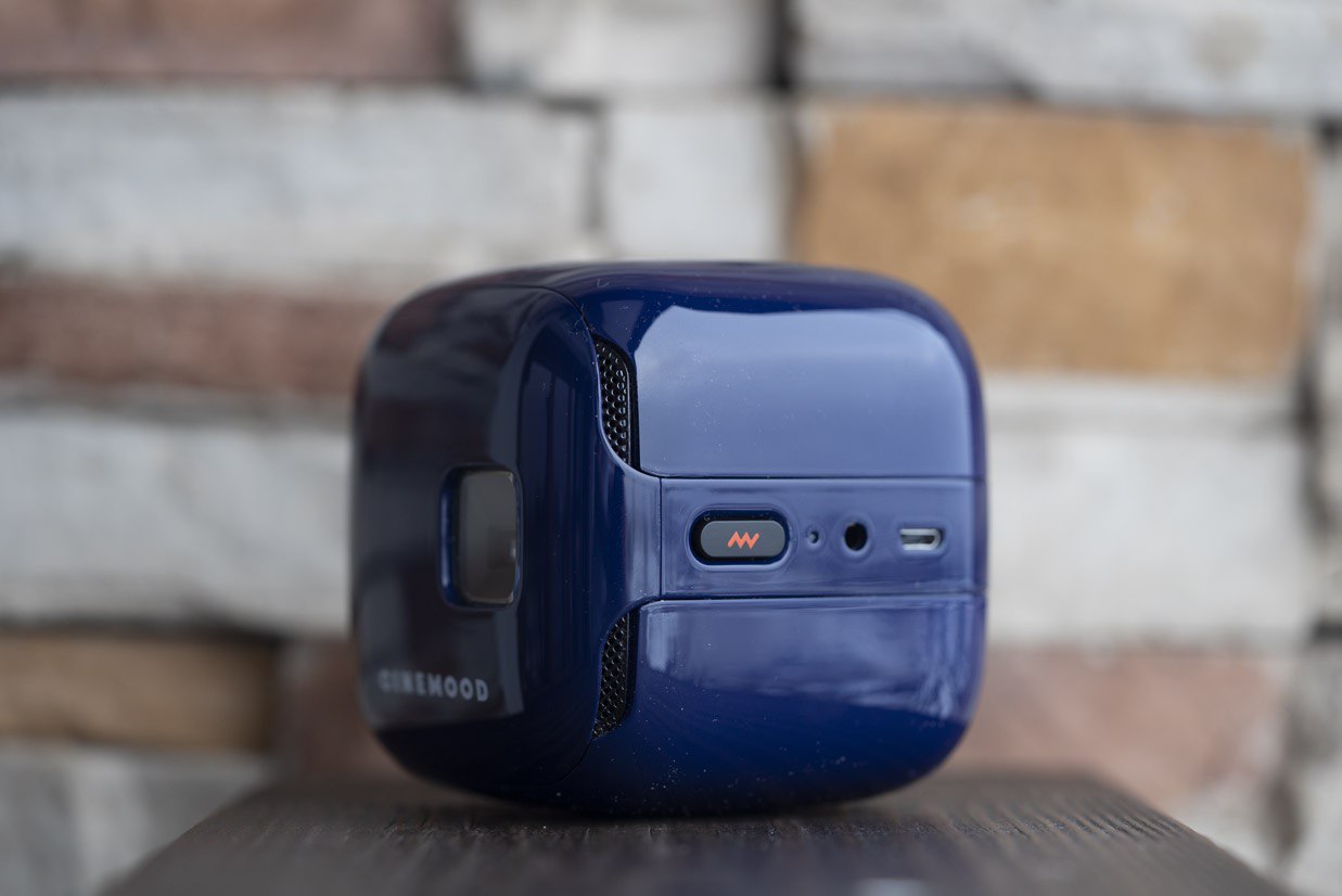 «Кинокубик» – тёмно-синий куб с размером грани 8 сантиметров, в котором спрятан DLP-проектор. Никаких кабелей ему не нужно, он автономен.