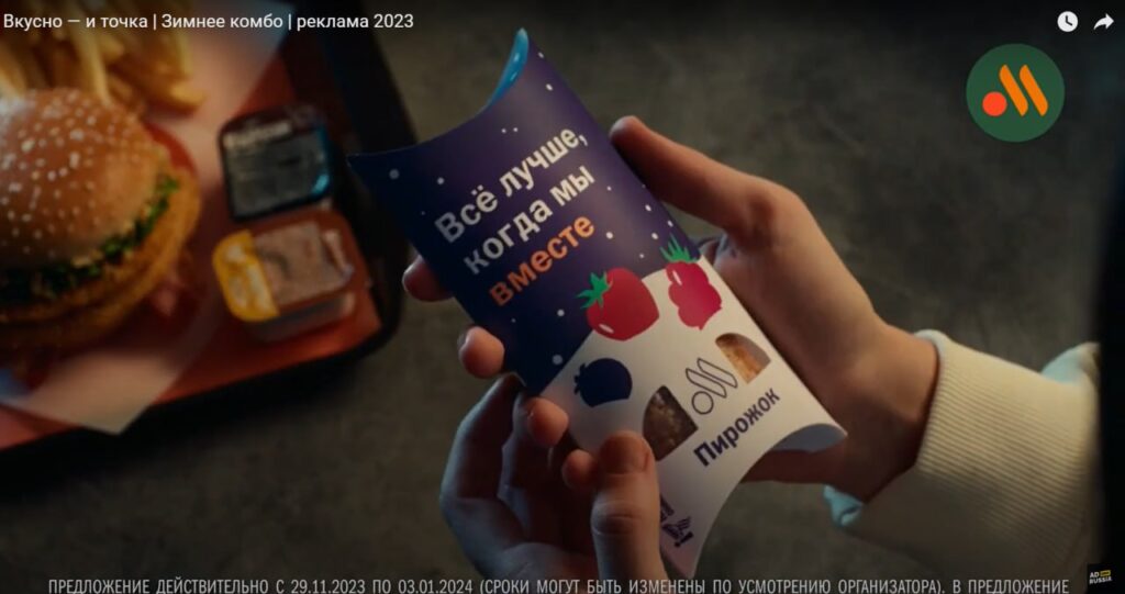 Рекламщики «Вкусно и точка» решили снять социальный ролик о проблемах отцов и детей. В видео родители провожают взрослую дочь на поезд, им всем неловко — разговор не клеится, и отец предлагает «зайти погреться» в ресторан быстрого питания. В заказе им попадается пирожок с трогательной надписью, который растапливает лед недопонимания в семье, и они начинают общаться с теплом и заботой!