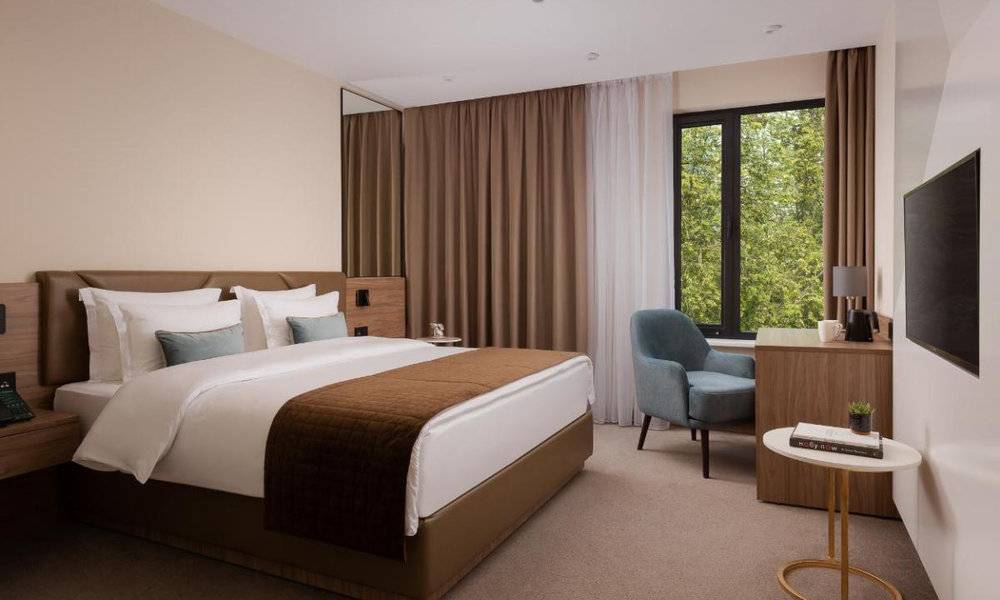 Красивейшая природа с хвойным парком на территории комплекса, речка Гвоздня, удобные номера, спа-центр, бассейны для взрослых и детей с водопадами и горками, анимация, игровые программы с детьми, мини-диско – все это к услугам проживающих.