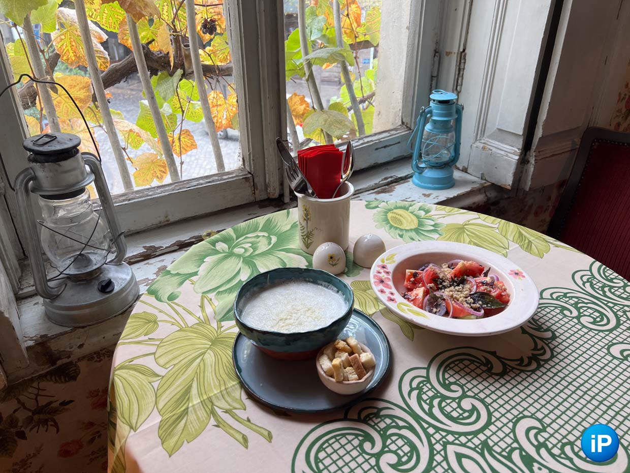 На пути есть множество ресторанов. Не забудьте заглянуть в кафе на первом этаже и попробовать ассортимент грузинских блюд. Есть несколько вкусных сладостей и, конечно, вода Лагидзе — местный газированный напиток на основе газированной воды и различных натуральных сиропов. Наш фаворит — смесь шоколада и сливок.