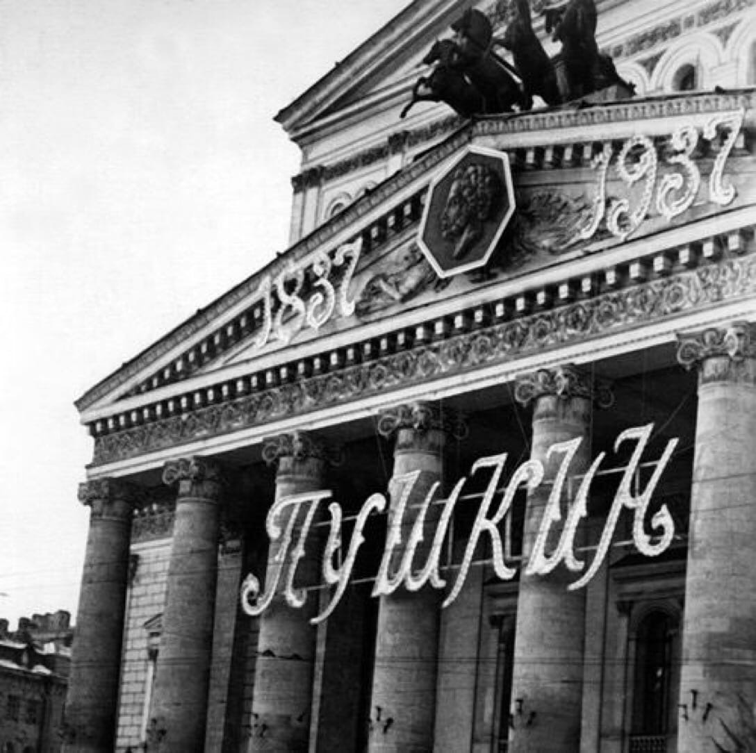 Здание Большого театра, украшенное к юбилею поэта. 1937 г.