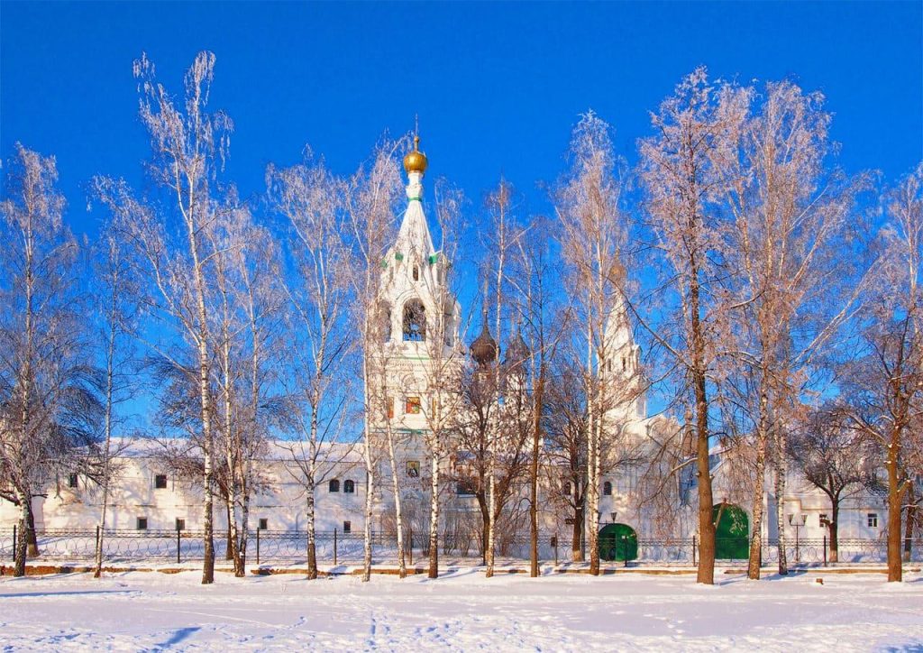Этот женский монастырь на месте деревянной церкви был построен в середине XVII в. на средства местного богатого купца. В его ансамбль входят пятиглавый Троицкий собор и Казанская надвратная церковь с колокольней.