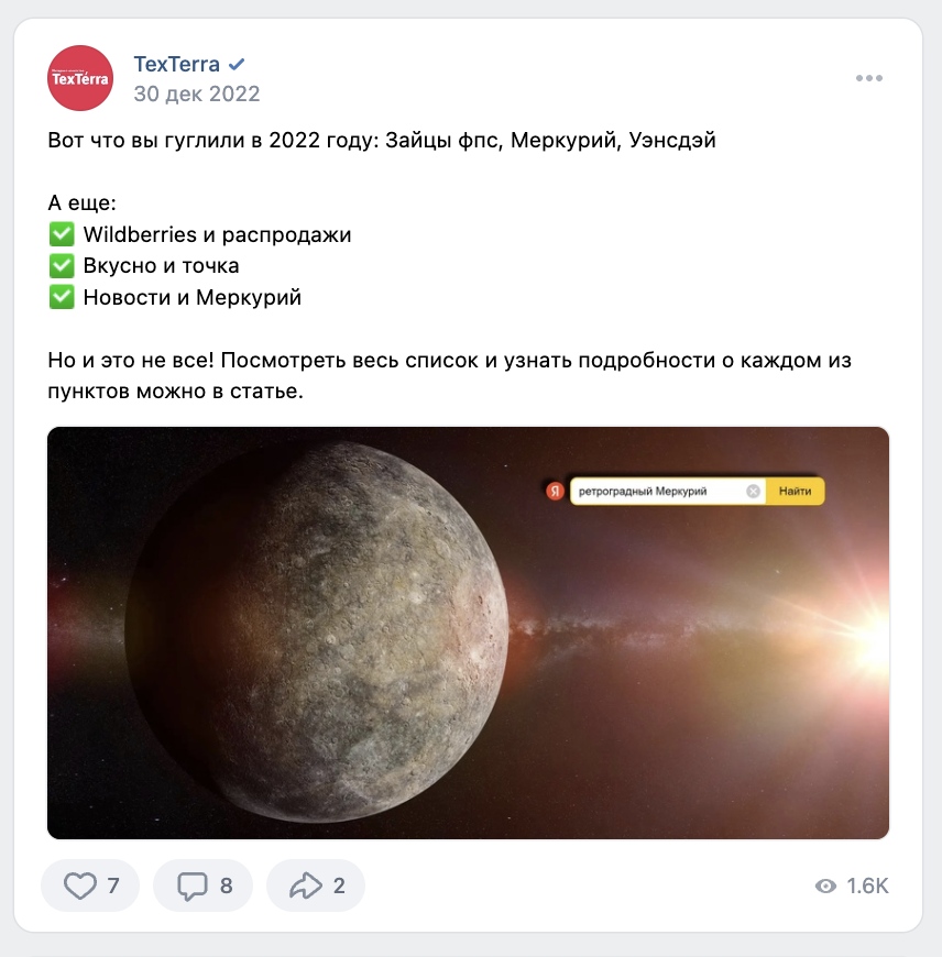 Здесь вы работаете сразу на два маркетинговых фронта. С одной стороны, людям интересно посмотреть, что было популярно и чем они интересовались в течение года. С другой стороны, подобные исследования пригодятся не только самим вашим клиентам в качестве развлечения, но и коллегам по отрасли для решения бизнес-задач.