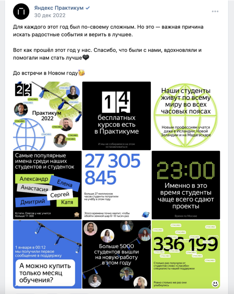 Поделитесь историями успеха ваших клиентов за год — это сработает и в качестве имиджевого инструмента, и в качестве продающего кейса. Покажите, как ваш продукт или услуга повлияли на их жизнь, как изменились ваши пользователи. Можно сделать доску почета и рассказать о клиентах с самыми высокими результатами или поделиться историями пользователей, которыми вы гордитесь.