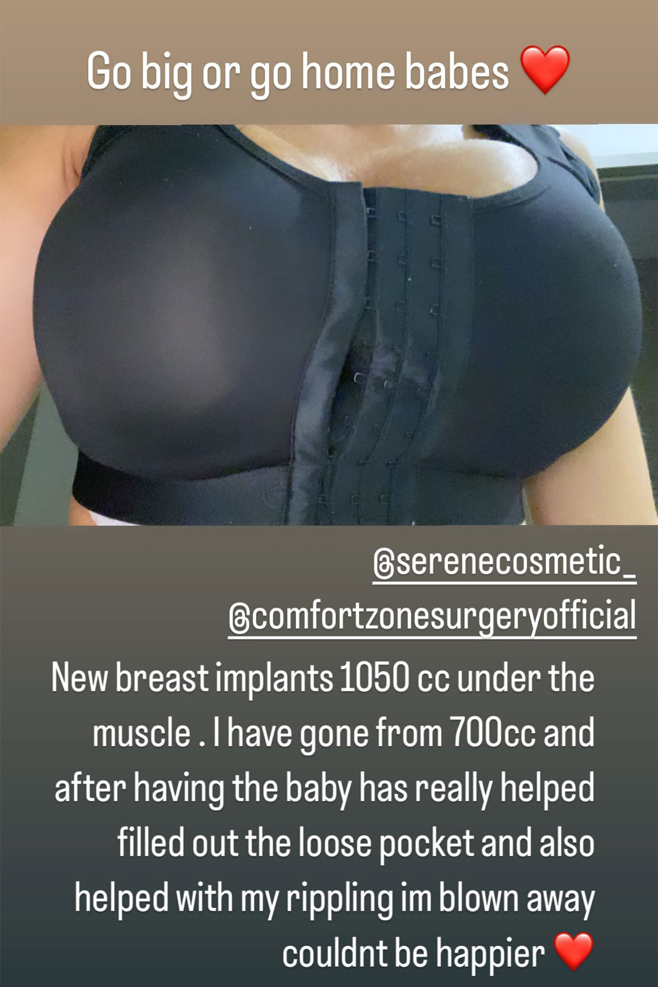 Она подробно рассказала о своих прошлых операциях: «Моя первая операция по увеличению груди в 18 лет, и вот я здесь, тот же человек, все еще люблю то, что люблю. Новые имплантаты в 32 года».