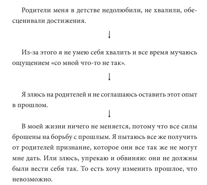 Вот он, замкнутый круг. Силы уходят, ситуация не меняется. Знаете, что нужно сделать? Оставить родителей в покое. И повзрослеть наконец. Формула взрослого человека такова: «Спасибо за то, что дали. А то, чего не дали, я возьму сама. Не хвалили, не поддерживали, не помогли сформировать крепкую самооценку? Что ж, дело за мной. Теперь это моя задача».