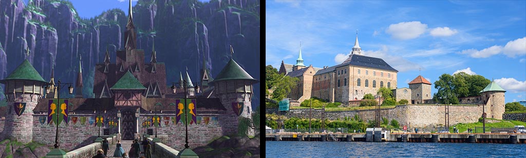 Учитывая, что «Холодное сердце» было вдохновлено скандинавской легендой, неудивительно, что замок в Эренделле, вымышленной стране фильма, основан на скандинавской архитектуре. Дворец украшен множеством панелей и колокольней, увенчанной шпилем. Укрепление вокруг замка основано на форте Акерсхус, первоначально бывшем военной цитаделью недалеко от Осло. С другой стороны, реальная резиденция была вдохновлена чем-то совершенно другим. Нарисованный дворец сделан из дерева. Эта деталь на самом деле не похожа на замок, но она больше похожа на норвежскую деревянную церковь, как церковь в Боргунде.