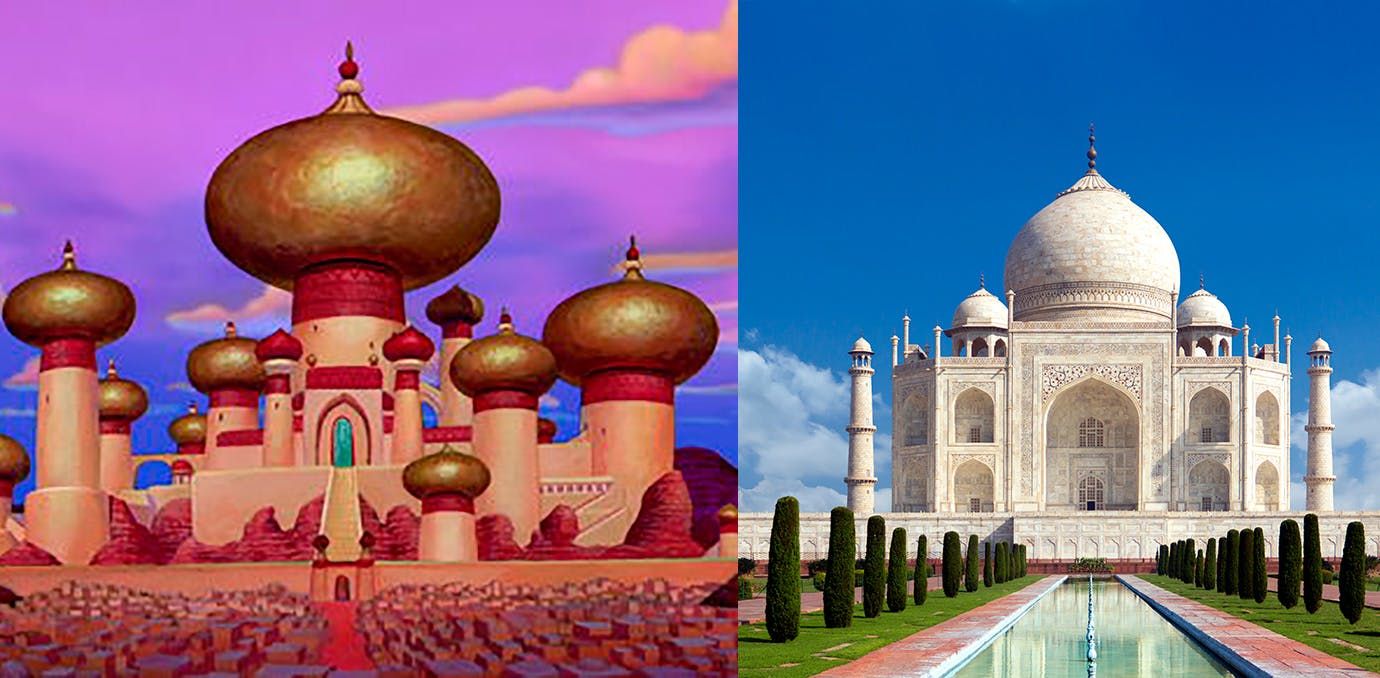 Справедливости ради, стоит отметить, что как раз этот пример, скорее всего, большинство зрителей разгадало самостоятельно. Это и неудивительно, ведь замок из знаменитого мультика про Алладина очень сильно напоминает свой прототип – легендарный Тадж-Махал. А, учитывая тот факт, что в основе этой придуманной истории лежат не только приключения, но и красивая любовь между Алладином и Жасмин, выбор в качестве прототипа главного замка города сооружение, построенное правителем в память о своей любимой женщине кажется очень символичным.