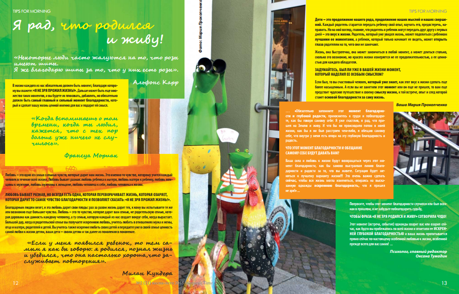 Дети – это продолжение нашего рода, продолжение наших мыслей и наших свершений. Каждый родитель старается передать ребенку свой опыт, научить его, предостеречь, направить. Но на мой взгляд, главное, что родитель и ребенок могут передать друг другу с первых дней – это вкус к жизни. Родитель, который уже увидел жизнь, может поделиться с ребенком лучшими ее моментами, а ребенок, который только начинает ее видеть, может открыть глаза родителям на то, чего они не замечают.