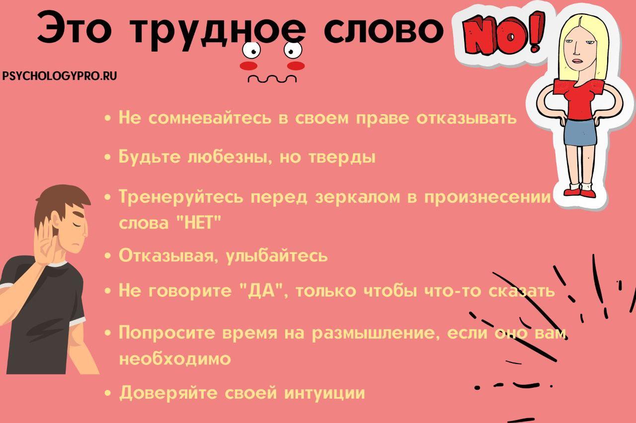 Почувствуйте удовольствие, отказывая! Пусть произнесенное слово “Нет” даст ощущение свободы от страха и неуверенности. Стоит помнить — отказывая, вы делает шаг в свою сторону.