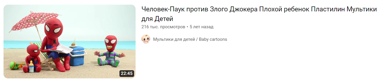 Она смотрела там ролики про цвета. Это тупейшее видео, где авторы, прикрываясь образовательным элементом собирают показы, чтобы заработать легкие деньги. Типичный сюжет: в кадре разноцветные предметы или игрушки и с ними что-то делают. Обычно, считают или показывают по одному. Иногда зеленый Спайдермен катается на зеленом тракторе, а красная Ледибаг соответственно на красном. Это называется «Изучаем цвета». Никогда не ищите в поиске Ютуба learning colors — вас эти ролики потом будут преследовать везде.