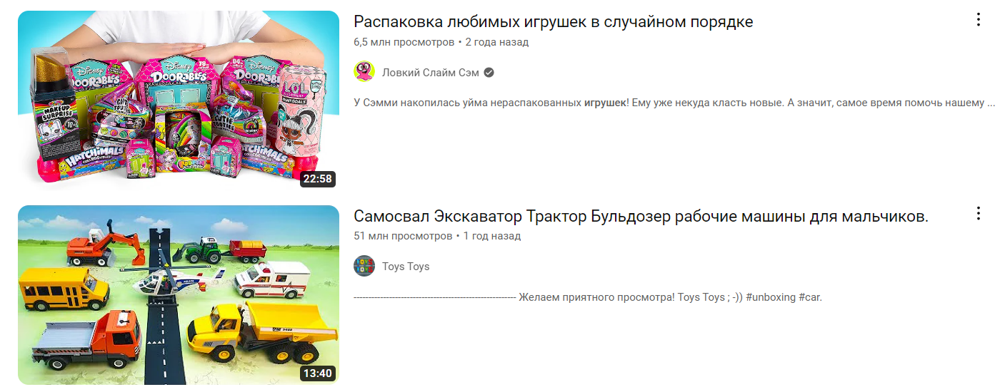 Единственный жанр, который остается относительно стабильным, — распаковка. И в 2009-м, и в 2017-м, и в 2023 году видео с приятно шуршащей под чужими руками упаковкой от очередной игрушки набирали десятки тысяч и миллионы просмотров.