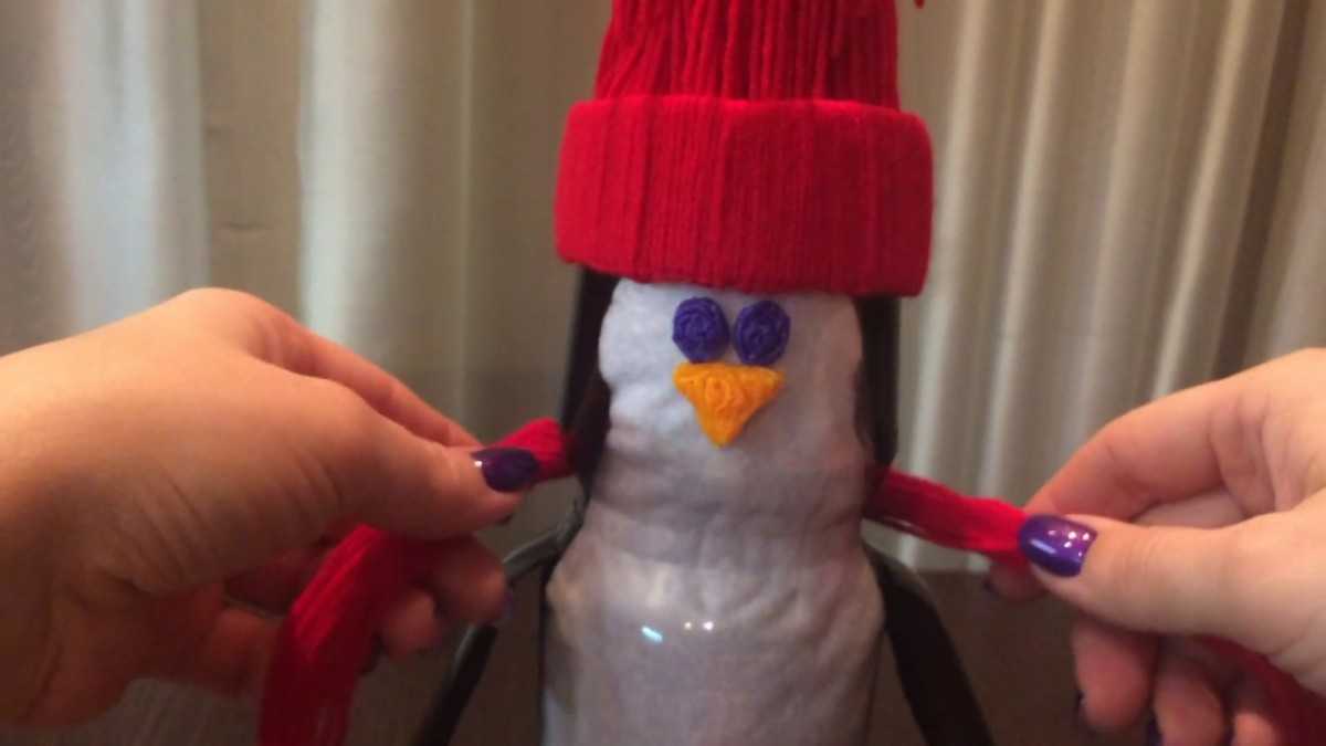 Декорировать можно чем захотите, например, старым шарфом и шапкой. Для глаз и пуговиц вполне могут пригодиться аналогичные сосуды чёрного цвета. Нос можно изготовить, выкроив и склеив конус из красной бутылки. Если сделать подсветку, в темноте фигурка будет выглядеть очень эффектно.