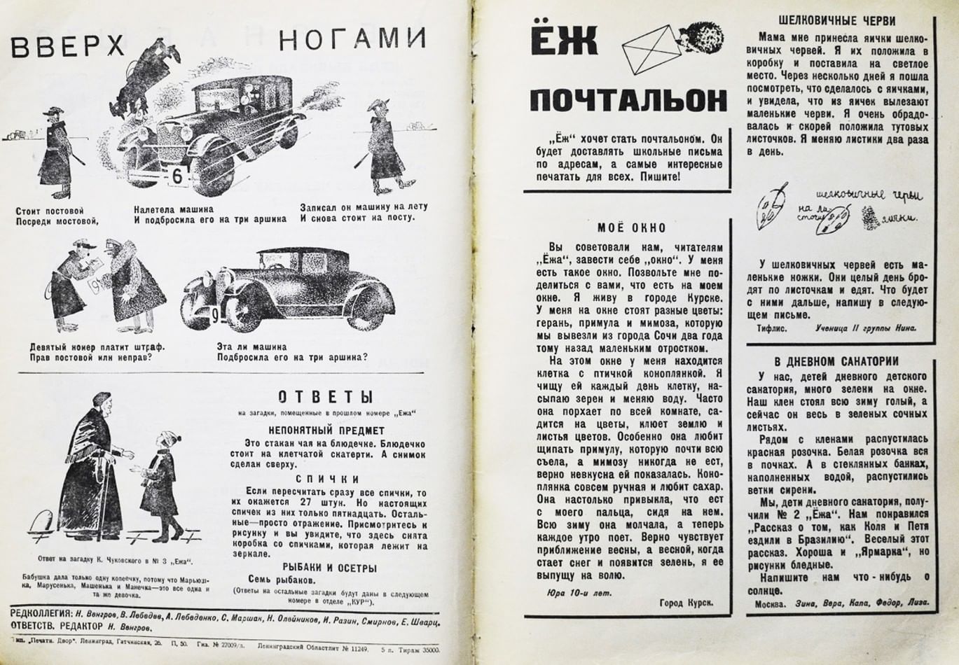 Журнал «Ёж» — в расшифровке «ежемесячный журнал» — был еще одним ярким проектом Самуила Маршака и неофициальным наследником «Нового Робинзона». В «Еже» творили поэты-обэриуты, не признававшие традиционные формы литературы, впервые публиковались Даниил Хармс , Александр Введенский, Николай Олейников и Николай Заболоцкий. Оформляли «Ёж» знаменитые советские художники Владимир Лебедев, Юрий Васнецов и Николай Радлов. Несмотря на то что журнал не отличался цветовым многообразием, он был богато иллюстрирован графикой и черно-белыми комиксами, для его оформления использовали разнообразные шрифты, силуэты и даже фотографии.