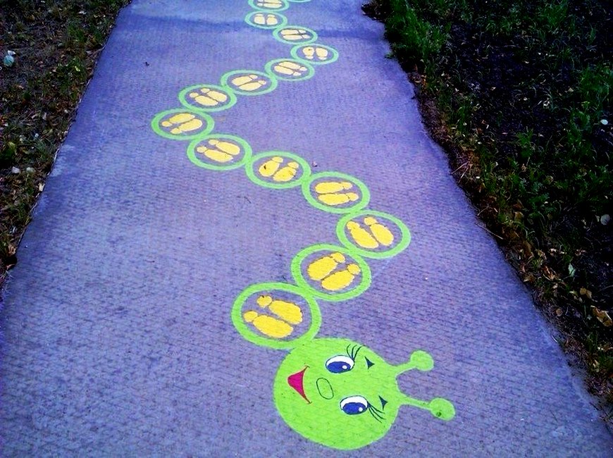 На асфальте рисуем гусеницу, что причудливо извивается. Внутри гусеницы рисуются «ножки» в виде босых ног. Они должны быть направлены в разные стороны. Цель этой игры – прыгать по следам. Прыгать придется по-разному: боком, спиной, влево и вправо. Эта игра отлично развивает координацию движений и ловкость.
