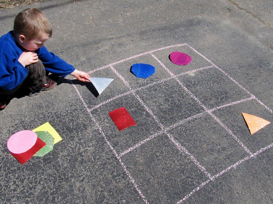 Мелками рисуем на асфальте «кочки». Они могут быть разных цветов, разных форм, с буквами или цифрами. Ребенку предложите прыгать с кочки на кочку и называть ее отличительные свойства: красная, квадратная, цифра 3, буква В и т.д.