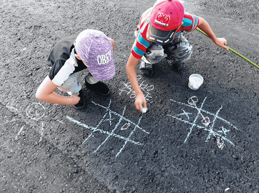 Это классическая игра для двух игроков, которая играется на квадратном поле 3×3 клетки. Каждый из игроков выбирает, что будет рисовать, крестики или нолики. Задача игры – начертить вряд свои символы, по диагонали или вертикали. Игрок, что первый начертит свои символы побеждает. Если все клетки поля заполняются, а ни один из игроков не собрал три символа в ряд, игра считается ничьей. Чертить символы удобнее всего мелом.