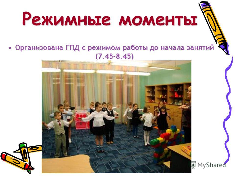 Организована ГПД с режимом работы до начала занятий ( )Организована ГПД с режимом работы до начала занятий ( ) Режимные моменты