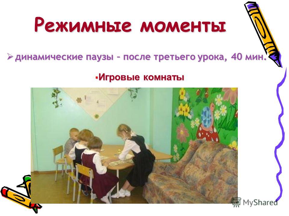 динамические паузы – после третьего урока, 40 мин. динамические паузы – после третьего урока, 40 мин. Игровые комнаты Игровые комнаты Режимные моменты