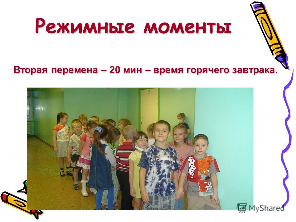 Вторая перемена – 20 мин – время горячего завтрака. Режимные моменты