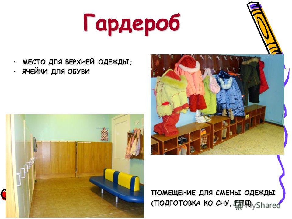 МЕСТО ДЛЯ ВЕРХНЕЙ ОДЕЖДЫ; ЯЧЕЙКИ ДЛЯ ОБУВИ ПОМЕЩЕНИЕ ДЛЯ СМЕНЫ ОДЕЖДЫ (ПОДГОТОВКА КО СНУ, ГПД) Гардероб