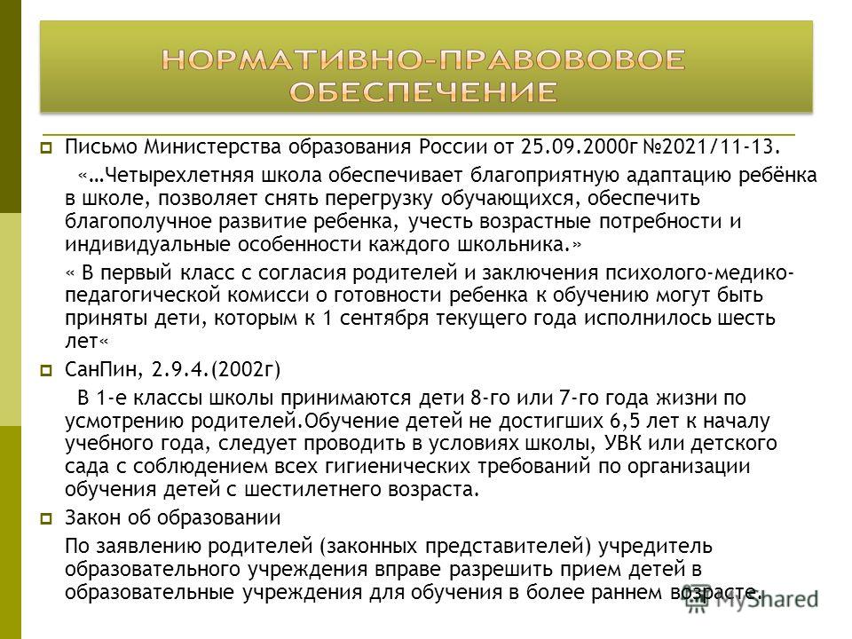 Письмо Министерства образования России от г 2021/ «…Четырехлетняя школа обеспечивает благоприятную адаптацию ребёнка в школе, позволяет снять перегрузку обучающихся, обеспечить благополучное развитие ребенка, учесть возрастные потребности и индивидуальные особенности каждого школьника.» « В первый класс с согласия родителей и заключения психолого-медико- педагогической комисси о готовности ребенка к обучению могут быть приняты дети, которым к 1 сентября текущего года исполнилось шесть лет« Сан Пин, (2002 г) В 1-е классы школы принимаются дети 8-го или 7-го года жизни по усмотрению родителей.Обучение детей не достигших 6,5 лет к началу учебного года, следует проводить в условиях школы, УВК или детского сада с соблюдением всех гигиенических требований по организации обучения детей с шестилетнего возраста. Закон об образовании По заявлению родителей (законных представителей) учредитель образовательного учреждения вправе разрешить прием детей в образовательные учреждения для обучения в более раннем возрасте.