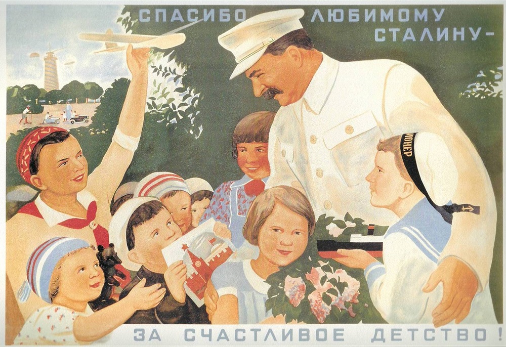 В середине 1930-х годов детская беспризорность в Советском Союзе официально считалась побеждённой. Ошибки начала 1920-х годов были учтены, а стратегия Феликса Дзержинского, претерпевшая изменения, дала положительные результаты. В 1936 году появился легендарный лозунг: «Спасибо товарищу Сталину за наше счастливое детство!» Эти слова прочно обосновались на открытках и плакатах, а подтверждали «счастливое детство» нарисованные дети, не менее счастливые. Посыл пропаганды был прост и понятен: такие картинки создавали ощущение, что каждый ребёнок находится под надёжным крылом советского государства. И впереди его ждёт только счастливое будущее.