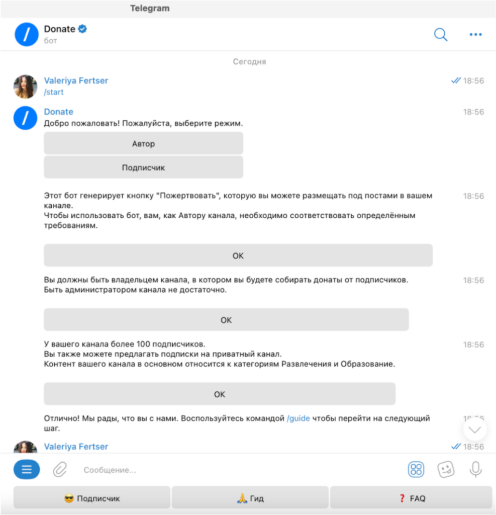 Еще один бот для формирования платных подписок и приема донатов. Бот с меткой верификации (синей галочкой), однако имеет сложную систему комиссий и удерживает 5% сервисного сбора с любой операции.