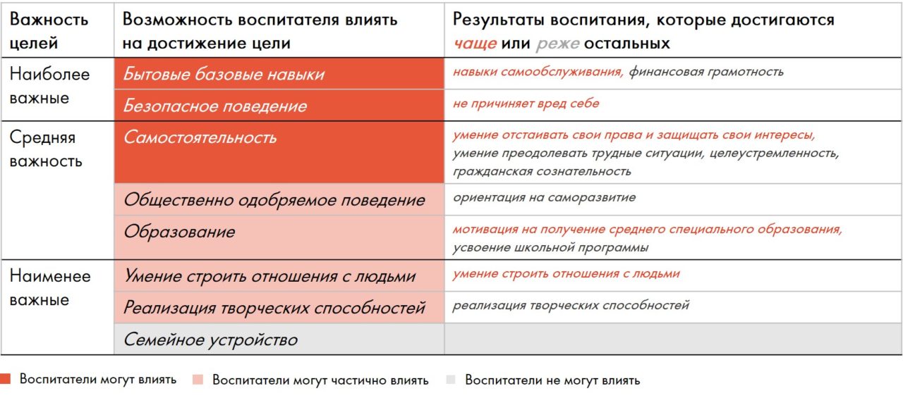 Сотрудники детских домов – будь то руководители, воспитатели или другие специалисты — в целом одинаково оценивают а) важность целей воспитания в детском доме и б) результативность системы детских домов в достижении этих целей. А именно, по мнению всех сотрудников детского дома, воспитатели успешнее всего работают над обеспечением безопасного поведения воспитанников и развитием у них базовых бытовых навыков, а также над развитием у детей умения строить отношения с людьми