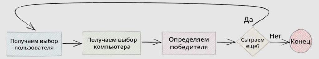 Хотя игра «камень, ножницы, бумага» кажется несложной, невероятно важно разобрать каждую деталь игры и все возможные сценарии. В любом проекте, даже в самом маленьком, блок-схема — незаменимый инструмент