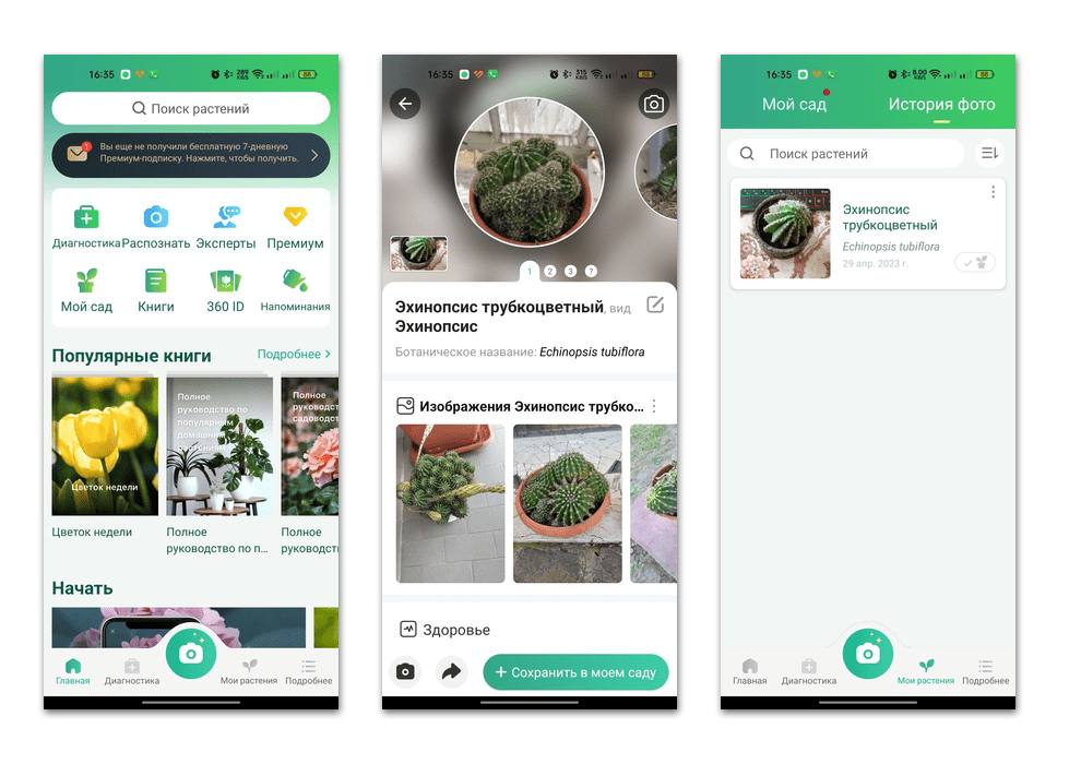 С распознаванием растений по фотографии справляется на отлично. Распознанное растение можно добавить в свой виртуальный сад, получить по нему полезную информацию по правильному содержанию и уходу и даже поставить напоминания когда его необходимо поливать, пересаживать и т. д.