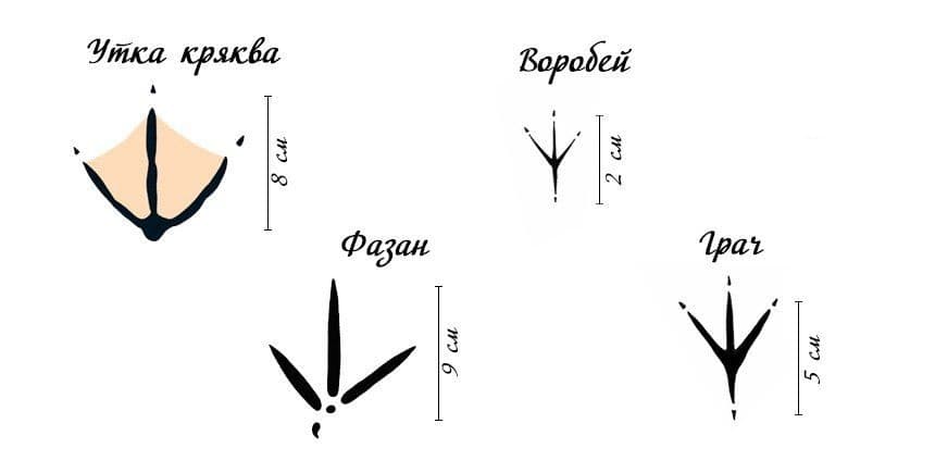 Очень легко распознать следы утки (кряквы): в них четко прорисованы перепонки. Фазаны оставляют довольно крупные следы с характерным отпечатком шпоры.