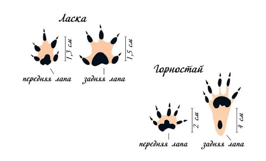 Ласки и горностаи тоже охотятся на мелких грызунов и домашнюю птицу по ночам. Эти юркие животные внешне очень похожи, но горностай крупнее ласки, поэтому его следы почти в 2 раза больше.
