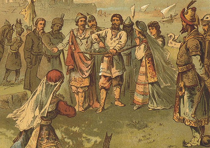 Согласно легенде, во время свадьбы Дунай и Настасья Королевична, которая тоже была богатыркой, начинают хвастать, Дунай — храбростью, а Настасья — меткостью. Они устраивают поединок и Настасья трижды простреливает серебряное кольцо, лежащее на голове у Дуная. Не в силах признать превосходство жены, Дунай приказывает ей повторить опасное испытание в обратном варианте: кольцо теперь на голове у Настасьи, а стреляет Дунай.