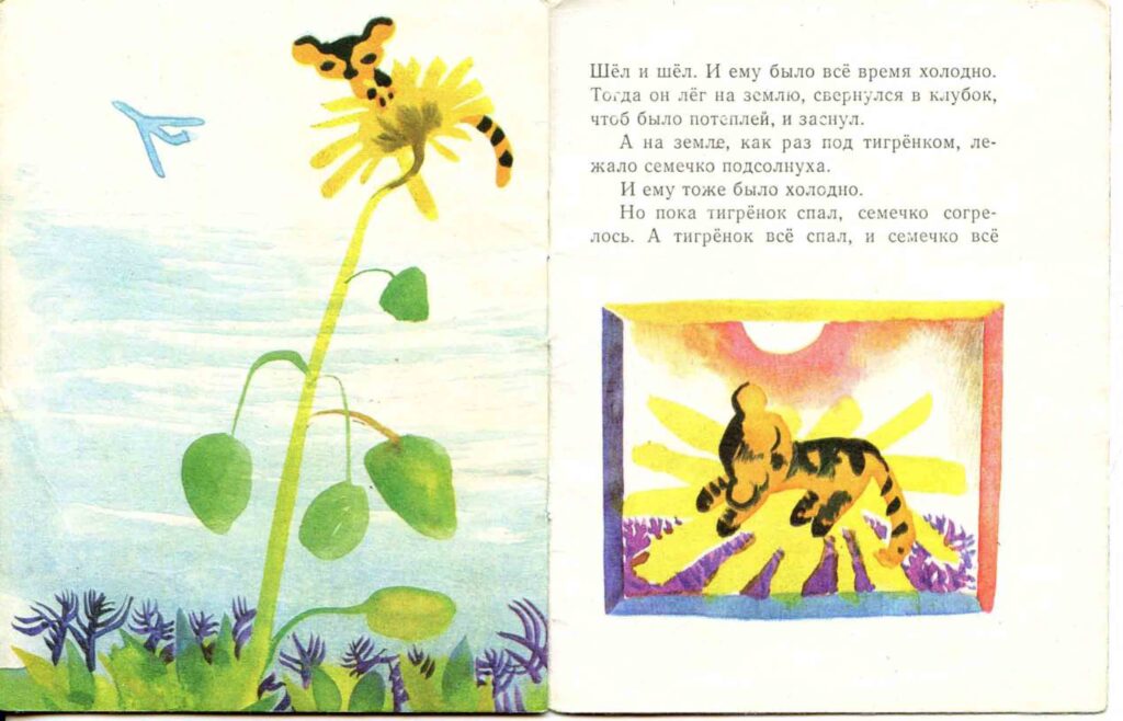 Только он хотел закрыть глаза, чтобы заснуть, как вдруг увидел на земле под снегом семечко подсолнуха.И тигрёнок сразу захотел это семечко разгрызть и съесть, но потом подумал: «Нельзя же всё на свете съесть. Пожалею-ка я это семечко, ведь оно, наверно, замёрзло». И тигрёнок подышал на семечко.Семечко чуть-чуть шевельнулось. Подышал ещё – семечко треснуло, и из него появился зелёный росток.Окружил его тигрёнок своими мягкими лапами, положил на лапы голову, да и заснул под вой метели.
