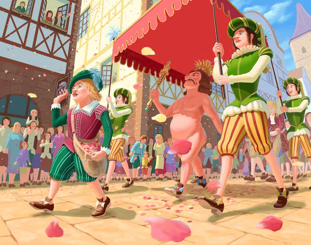 Король очень любит наряжаться и нанимает двух портных, которые на самом деле ничего в швейном деле не смыслят. Они пообещали, что сошью платье, невидимое для глупцов.