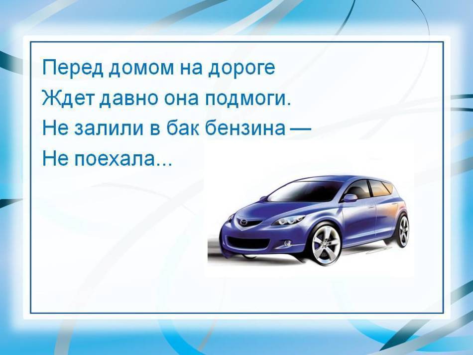 Пьет бензин, как молоко, Может бегать далеко. Возит грузы и людей. Ты знаком, конечно, с ней? Ответ — автомобиль.