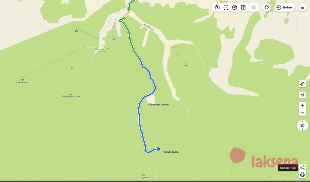 Если от Врат любви продолжить движение по тропе, то можно выйти к ручью Татарскому на улицу Алтайская. Ну а мы вернулись обратно мимо Четырех братьев на дорогу к автомобилю.