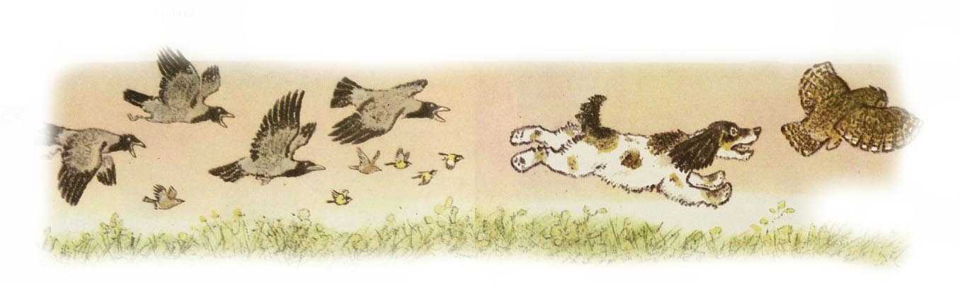 Я забыл сказать, что когда филин становился на крыло, Сват успел-таки вцепиться зубами в хвост, но филин рванулся, и Сват остался с филиновыми перьями и пухом в зубах. Озлобленный неудачей, он помчался полем за филином и первое время бежал, не отставая от птиц.